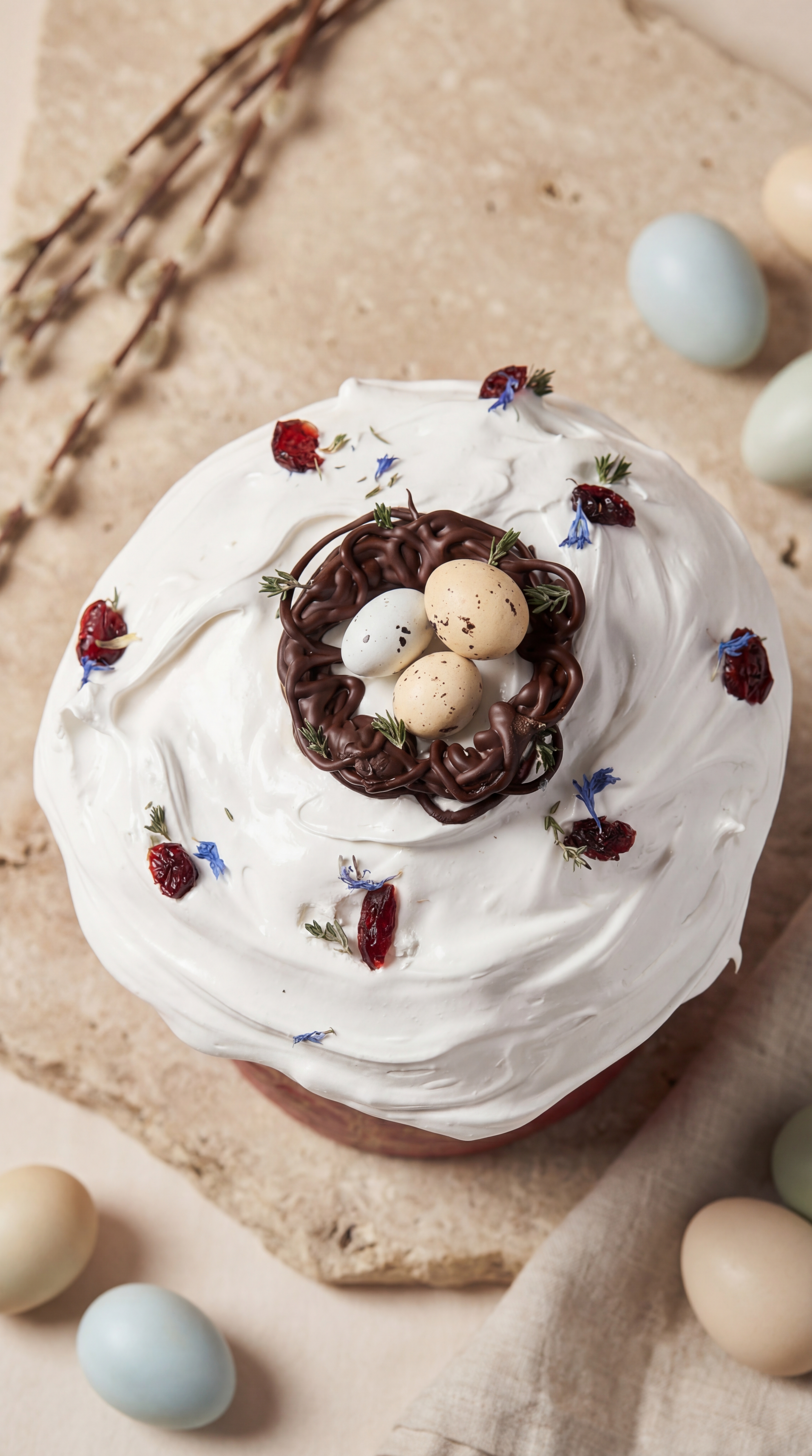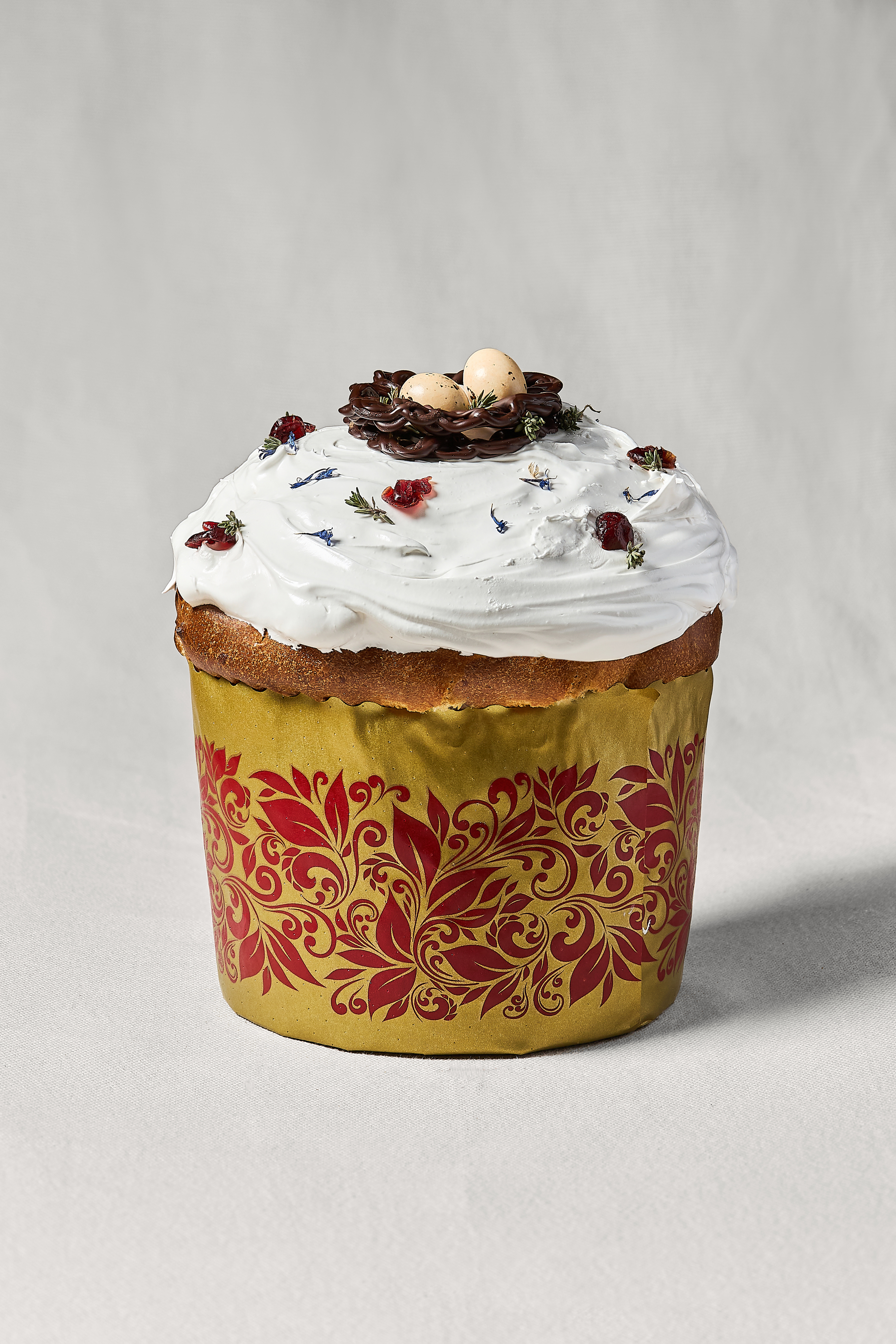 Пасхальный кулич с цукатами и вяленой клюквой, покрыт глазурью из итальянской меренги.